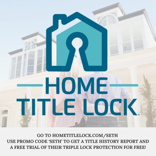 Go to https://hometitlelock.com/seth and use promo code SETH to get a title history report and a FREE TRIAL of their Triple Lock Protection for FREE! For details visit https://hometitlelock.com/warranty