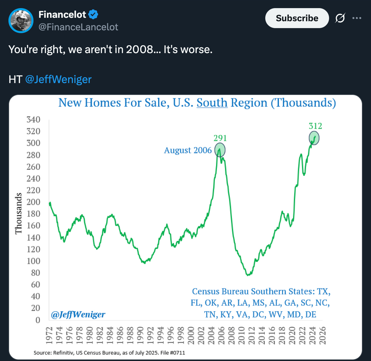 New home sales in the Southern U.S. are tracking almost identically to the buildup before the 2006–2007 collapse. The cycle is repeating itself—nearly step for step.