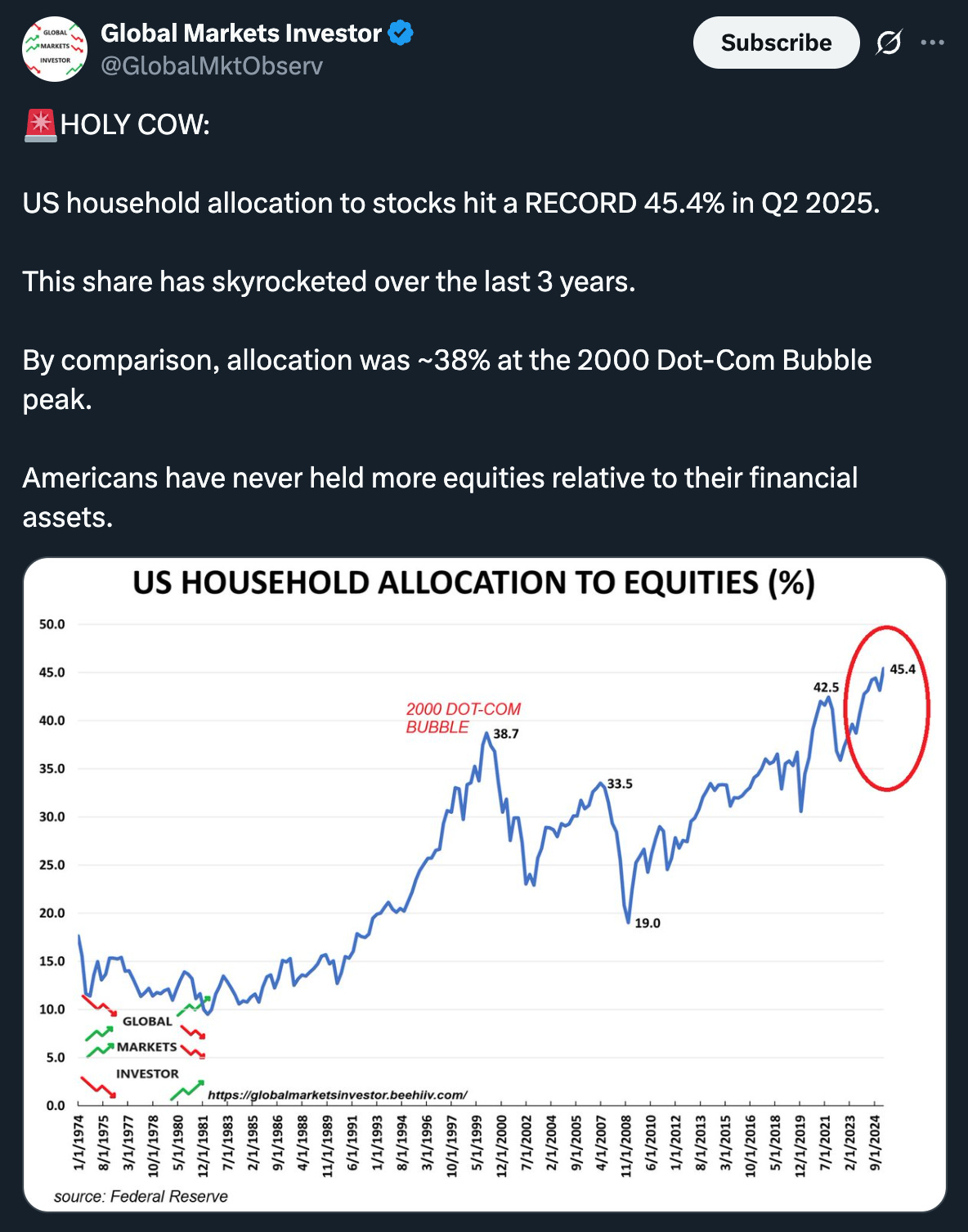 Meanwhile, U.S. households now have 45% of their financial assets in equities—an all-time high. Higher than the dot-com bubble. Higher than just before the Great Depression.