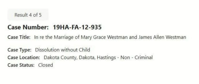 Parentage questions: Westman bore almost no resemblance to his supposed father, sparking questions about adoption or fostering. Stranger still, a Minnesota court record from 2012 showed Mary Grace and James West filing for divorce “without children,” even though Robert/Robin would have been ten years old at the time. Hours after researchers flagged the record online, it disappeared from the public court portal. Whether clerical error or deliberate scrubbing, it only deepens the mystery.