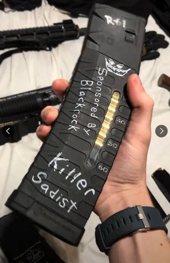The “Sponsored by BlackRock” graffiti on Westman’s magazine was not accidental. Whether mocking, signaling, or both, it was meant to be read and dissected. We saw something similar when Thomas Crooks, the young man who attempted to assassinate Donald Trump in Butler, Pennsylvania, was later revealed to have appeared in a BlackRock commercial.
